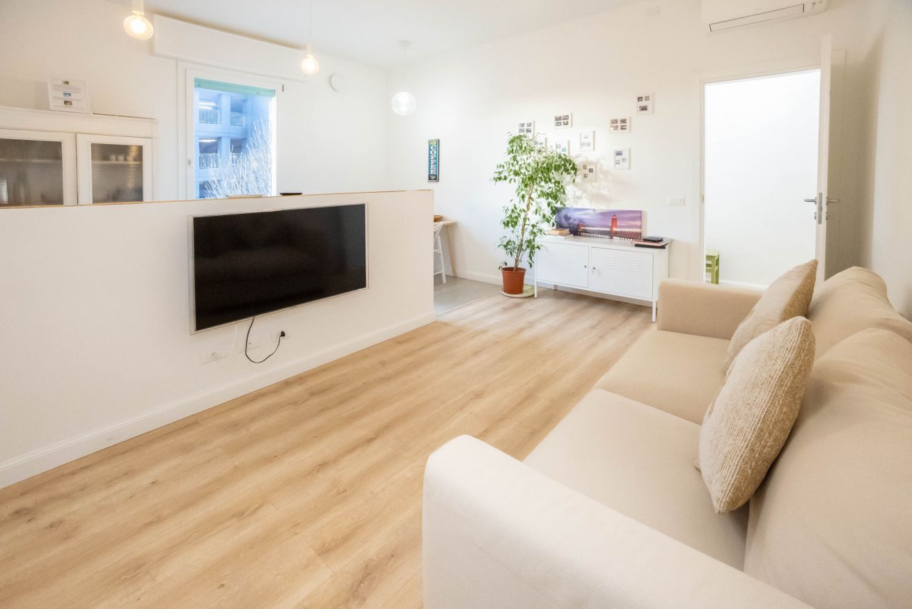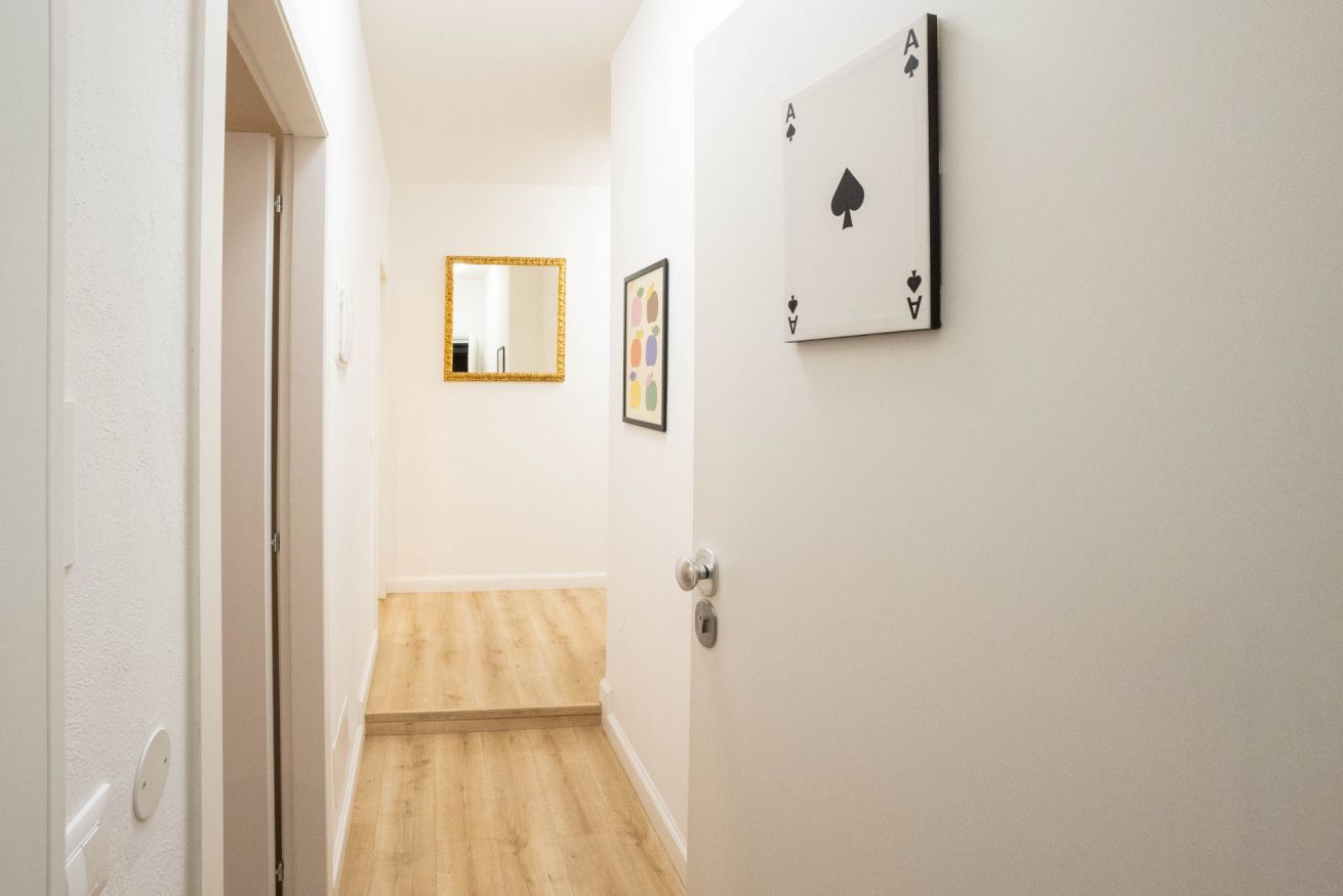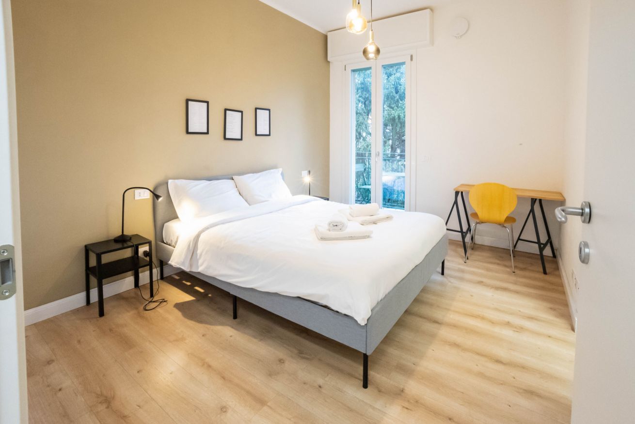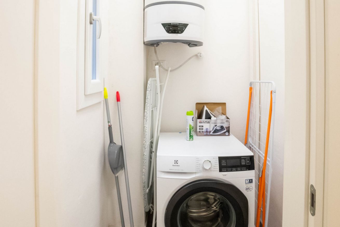 L'appartamento, al secondo piano senza ascensore, si apre su uno spazio che comprende un divano, che si può aprire e può ospitare due persone, una tv, un tavolo con sedie e un angolo cucina con utensili, piano cottura, frigorifero, lavastoviglie e macchina per il caffè. In camera è presente un armadio, una scrivania e un comodo letto matrimoniale. Infine è presente un bagno con bidet, box doccia e lavatrice.