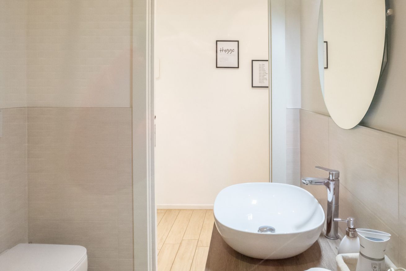 I materiali naturali, la luminosità, l’atmosfera accogliente ed i colori freschi trasmettono fin da subito un senso di serenità “Hygge”, al quale si ispira l’arredo in stile nordico di questo appartamento.