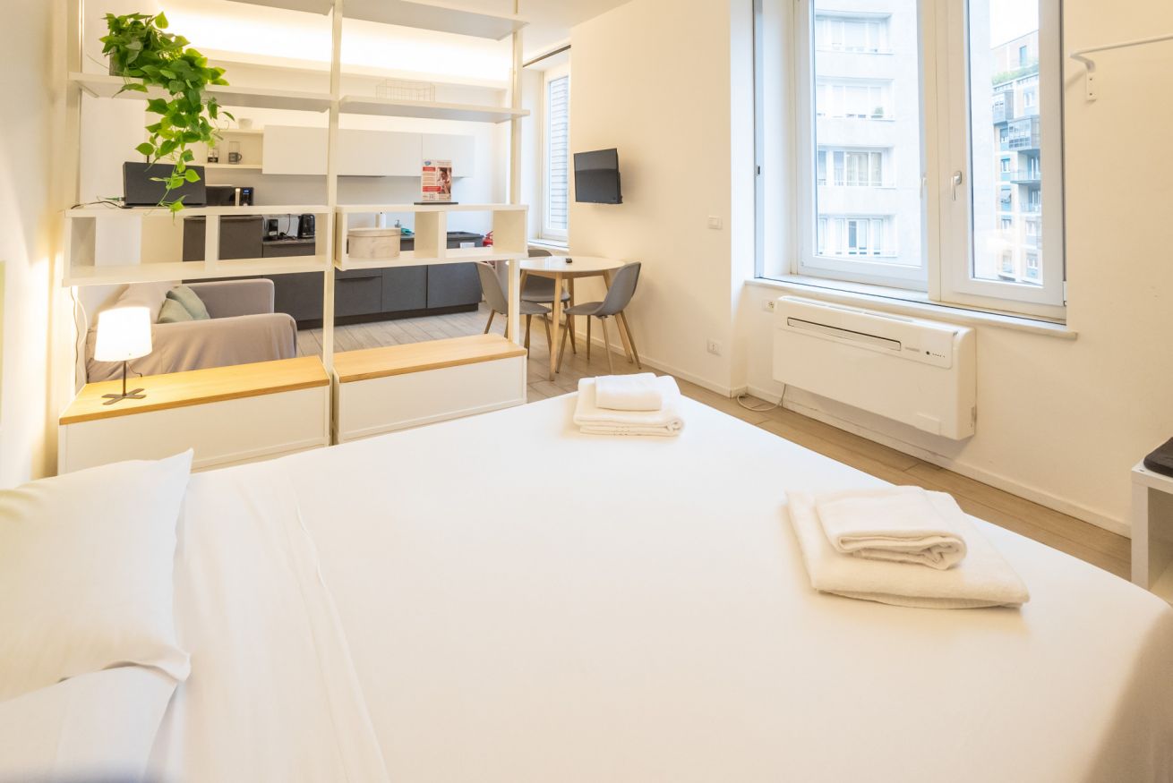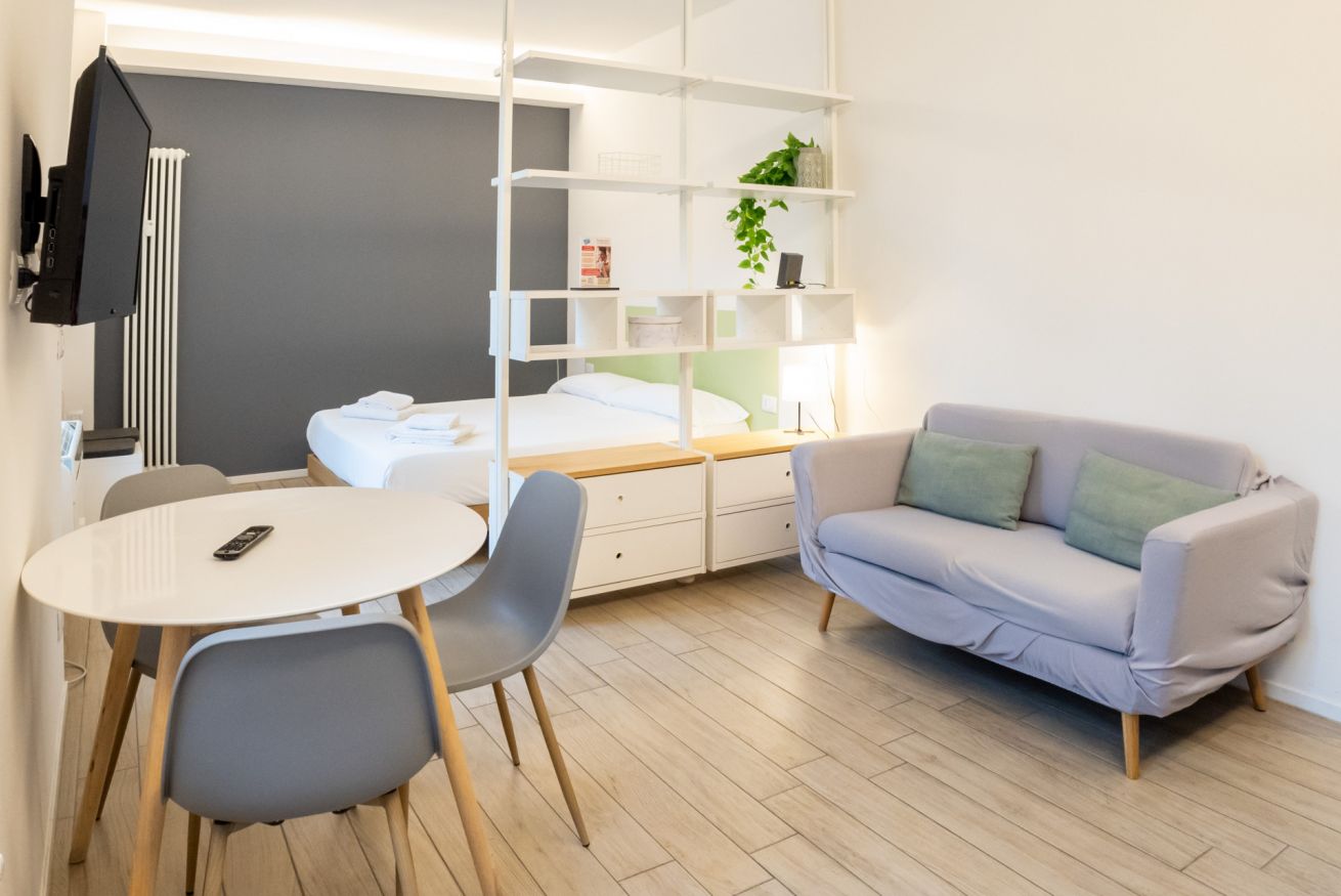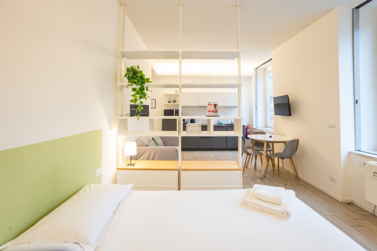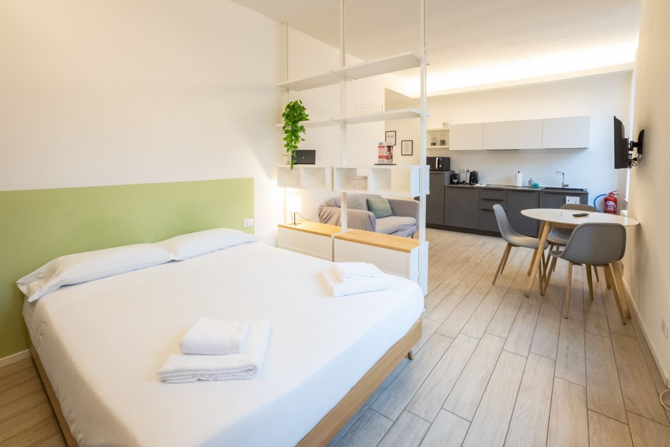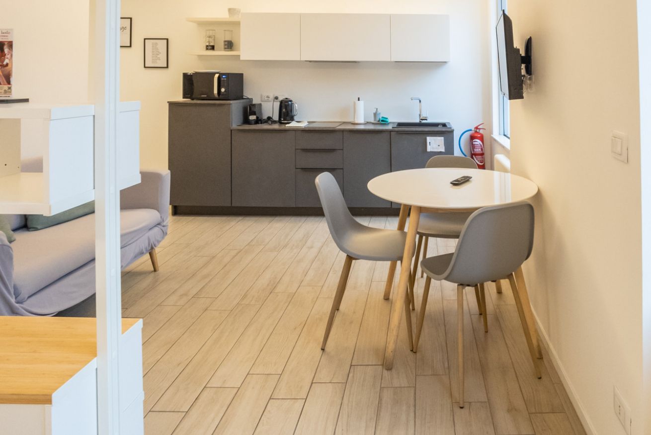 Varcando la porta di ingresso si accede alla zona living con angolo cottura, dotato di piano a induzione e forno microonde, ed un tavolo da pranzo capace di ospitare fino a 3 persone. La zona notte, con un comodo letto matrimoniale, è separata dalla zona giorno da una libreria in arredo. L'appartamento è inoltre dotato di TV a schermo piatto e gli infissi, di ultima generazione, hanno un' ottima tenuta termica ed acustica. Completa l'appartamento un elegante bagno con ampia doccia.