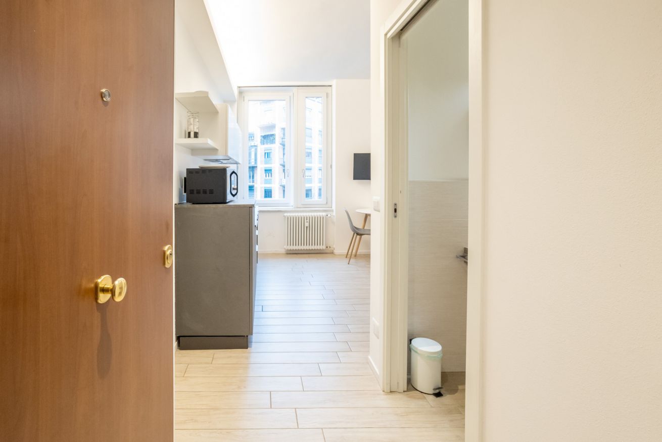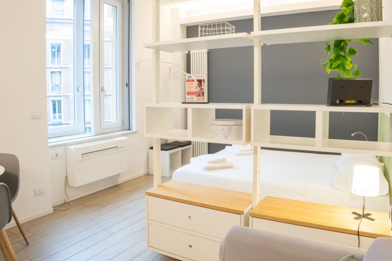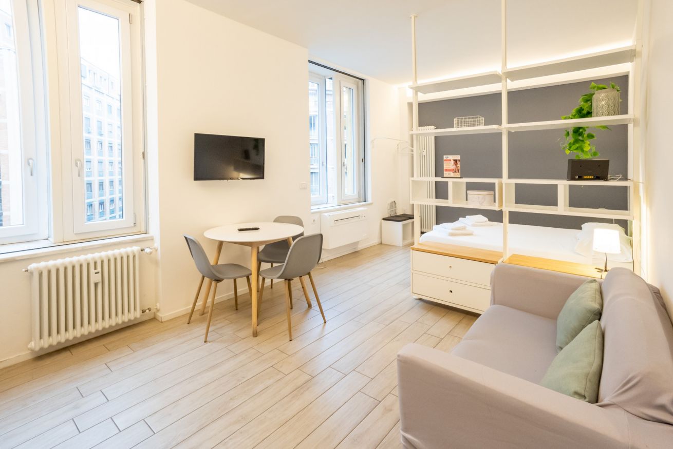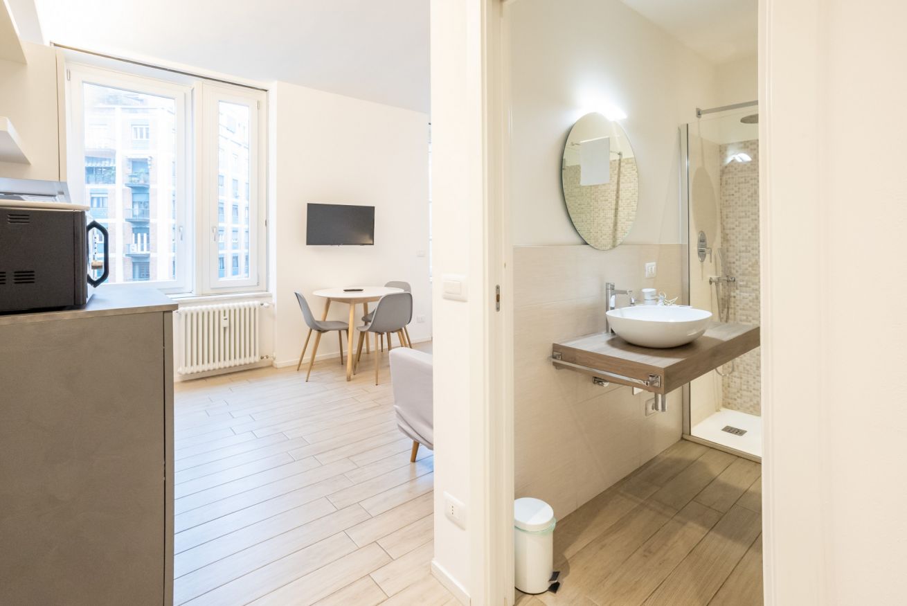Varcando la porta di ingresso si accede alla zona living con angolo cottura, dotato di piano a induzione e forno microonde, ed un tavolo da pranzo capace di ospitare fino a 3 persone. La zona notte, con un comodo letto matrimoniale, è separata dalla zona giorno da una libreria in arredo. L'appartamento è inoltre dotato di TV a schermo piatto e gli infissi, di ultima generazione, hanno un' ottima tenuta termica ed acustica. Completa l'appartamento un elegante bagno con ampia doccia.