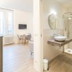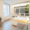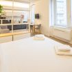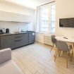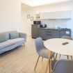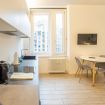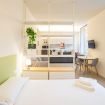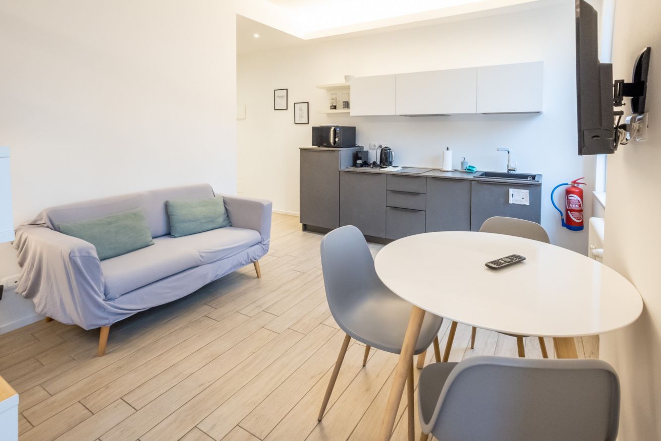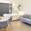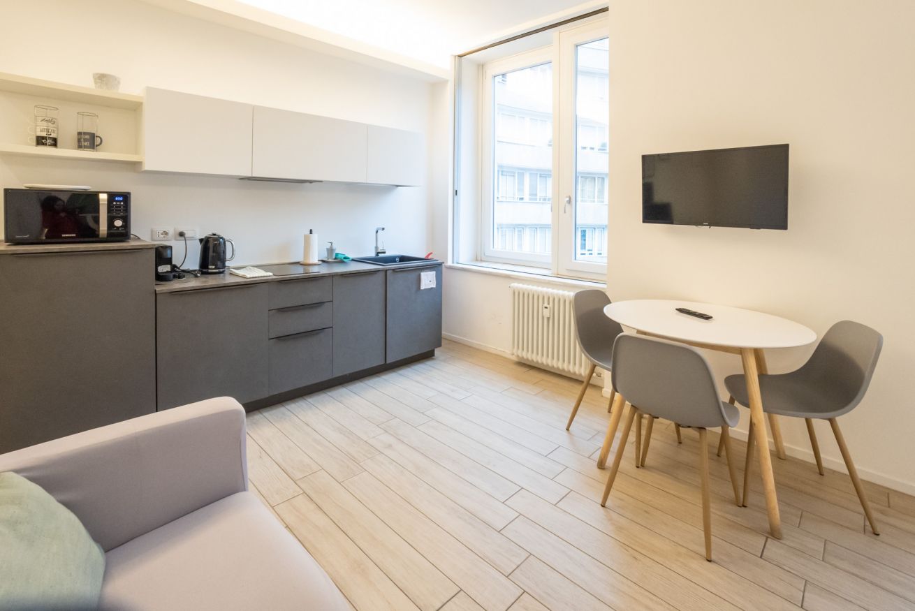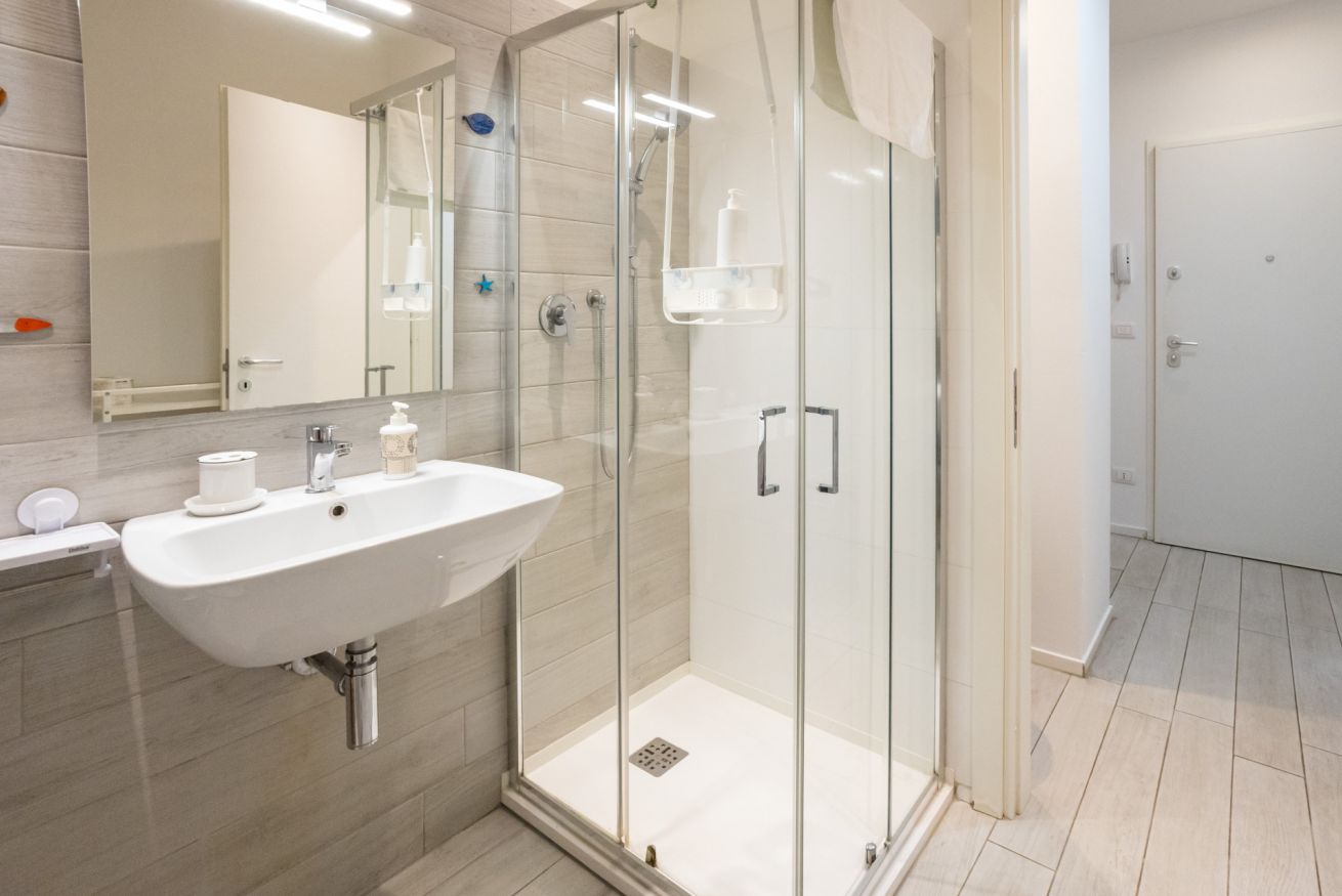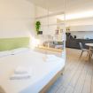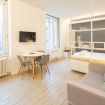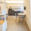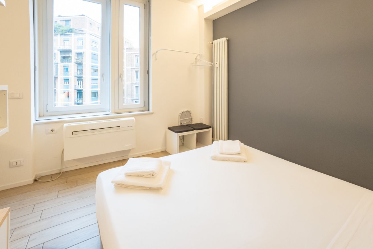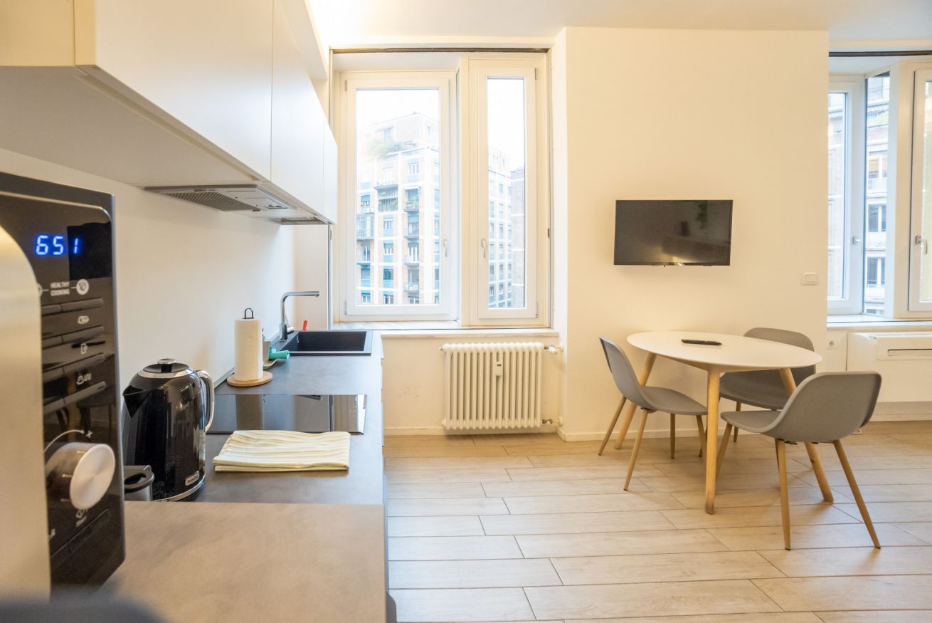 Varcando la porta di ingresso si accede alla zona living con angolo cottura, dotato di piano a induzione e forno microonde, ed un tavolo da pranzo capace di ospitare fino a 3 persone. La zona notte, con un comodo letto matrimoniale, è separata dalla zona giorno da una libreria in arredo. L'appartamento è inoltre dotato di TV a schermo piatto e gli infissi, di ultima generazione, hanno un' ottima tenuta termica ed acustica. Completa l'appartamento un elegante bagno con ampia doccia.