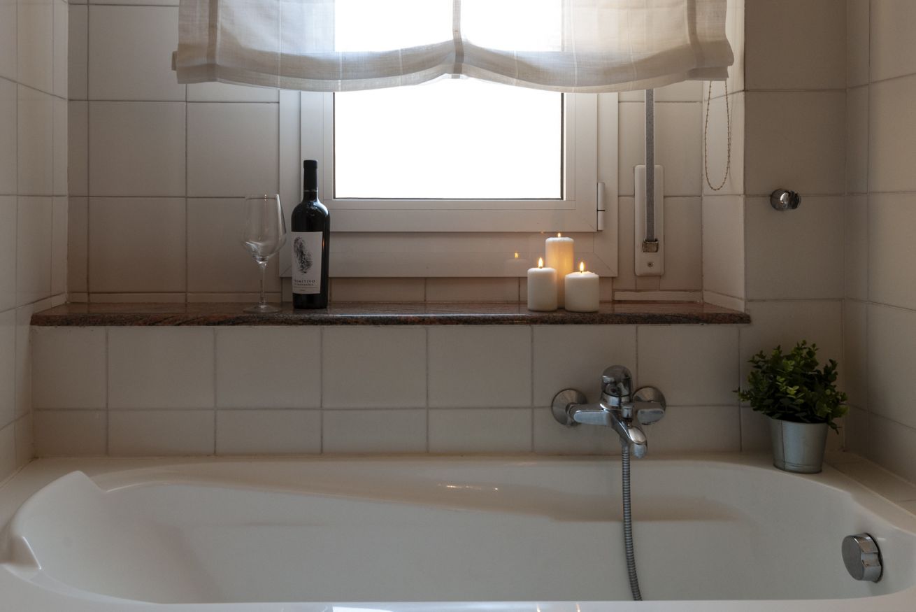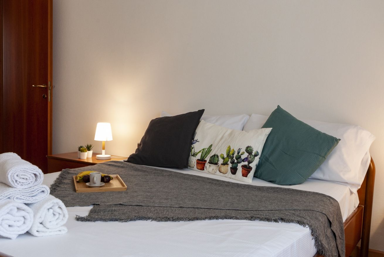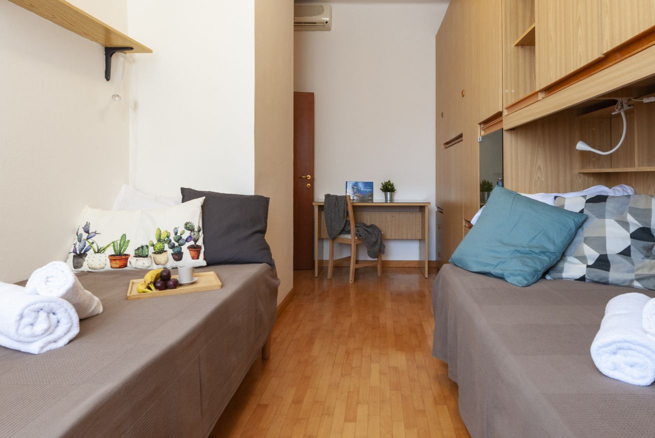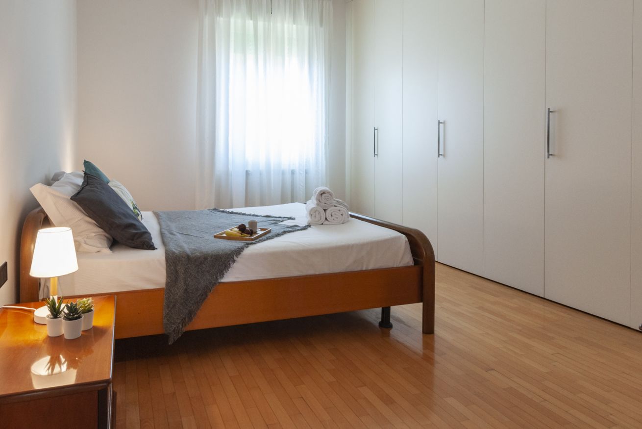 La zona notte è composta da una camera con letto matrimoniale ed una camera con due letti singoli. Il bagno finestrato è dotato di vasca. Appartamento dotato di aria condizionata.