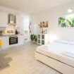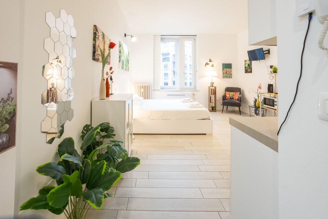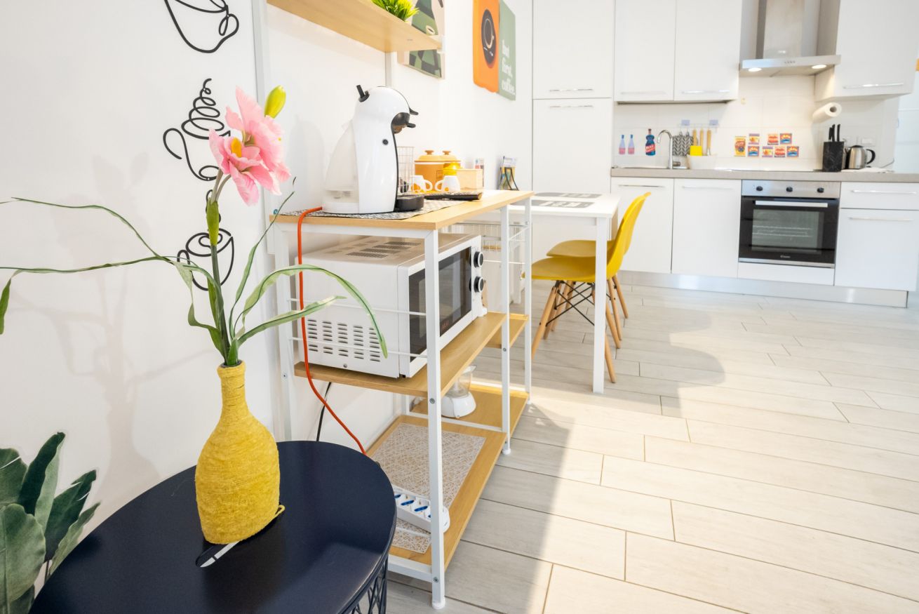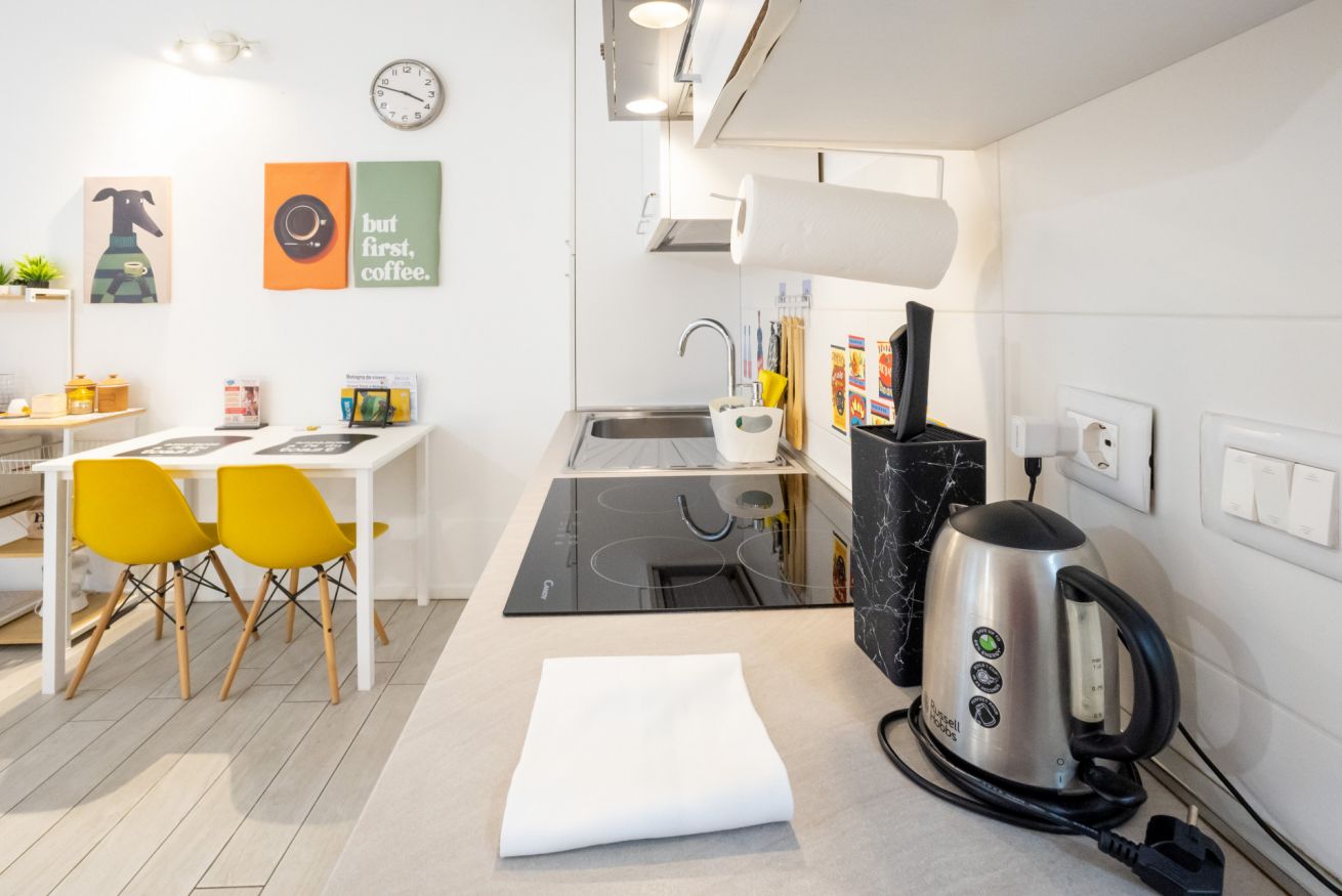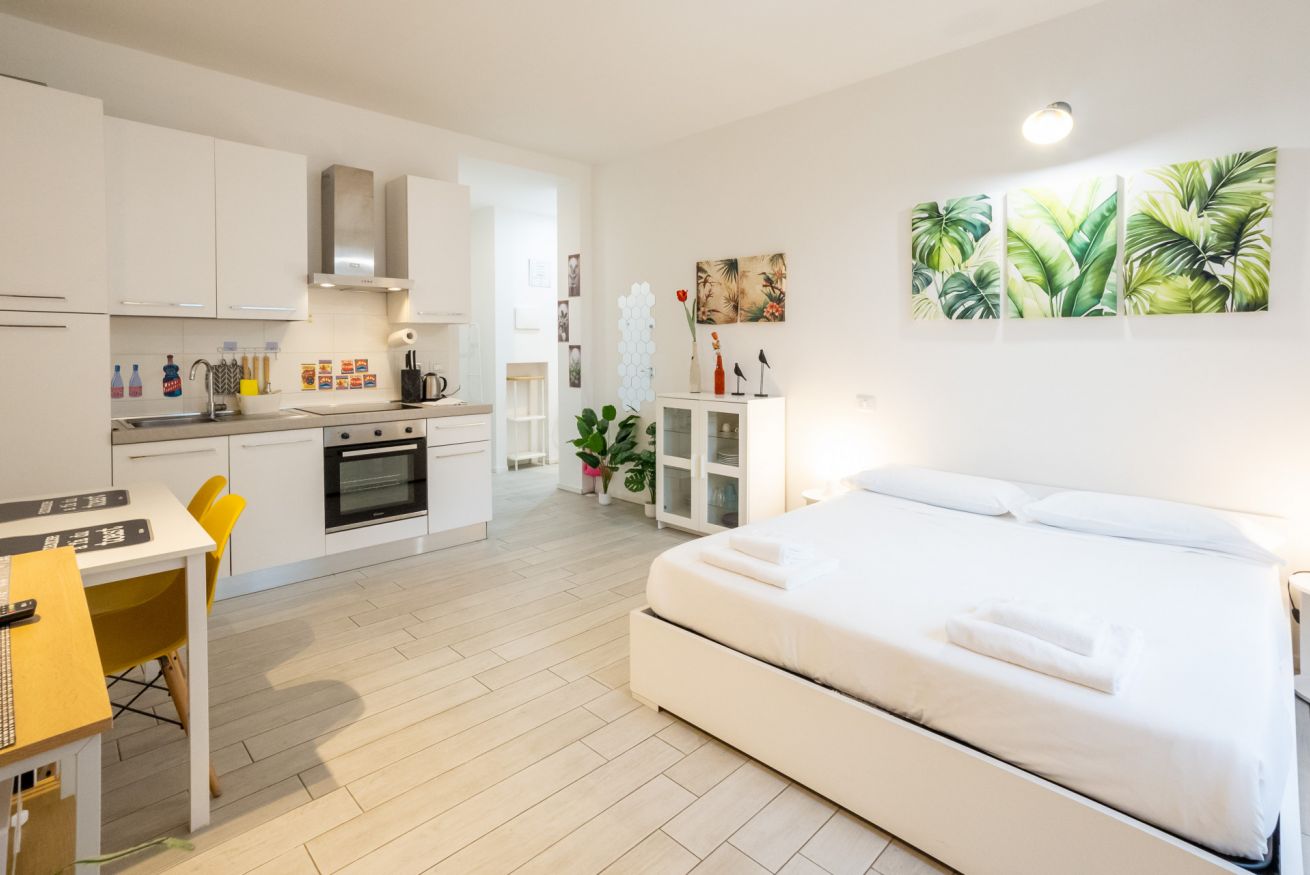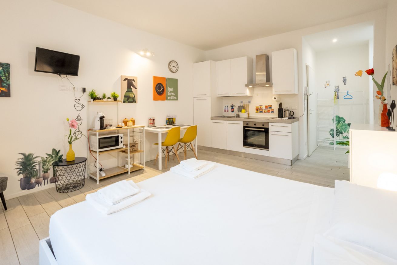 L'appartamento, dotato di aria condizionata, è stato ristrutturato di recente con grande cura nella scelta dei materiali. L'accogliente ingresso si apre sul vano unico che comprende la zona living con tavolo da pranzo capace di accogliere 2 persone e l'angolo cottura dotato di forno elettrico, piano cottura ad induzione, frigo e microonde oltre a bollitore e macchina per il caffè.