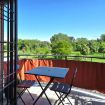 on sedie, una tv, un divanetto a un comodo letto matrimoniale. Da questo spazio si accede a un prezioso terrazzino esterno che affaccia su un vasto giardino e dove si trova un tavolo con sedie. In bagno troviamo un box doccia, un bidet e una lavatrice.