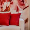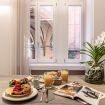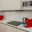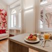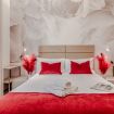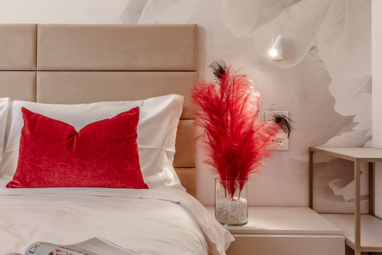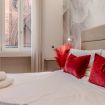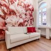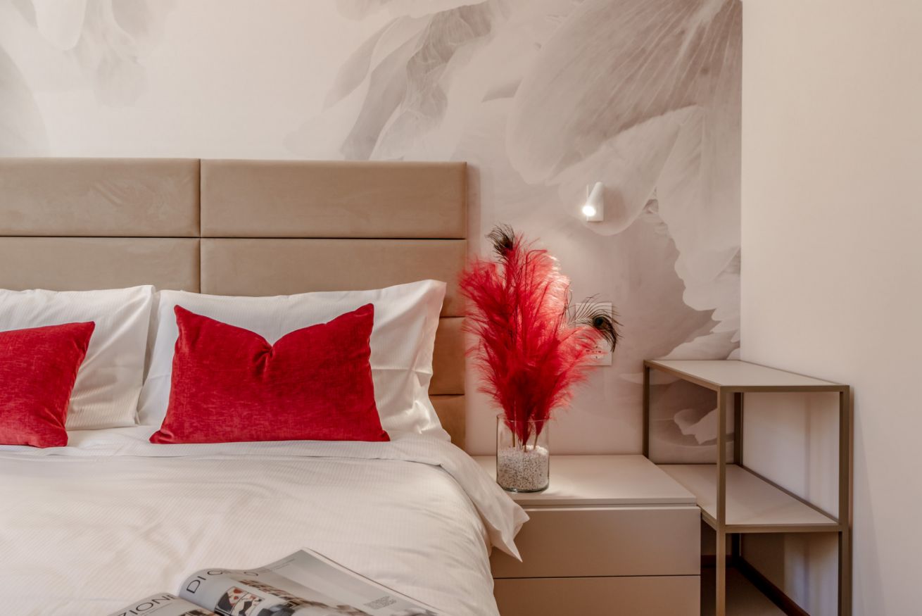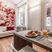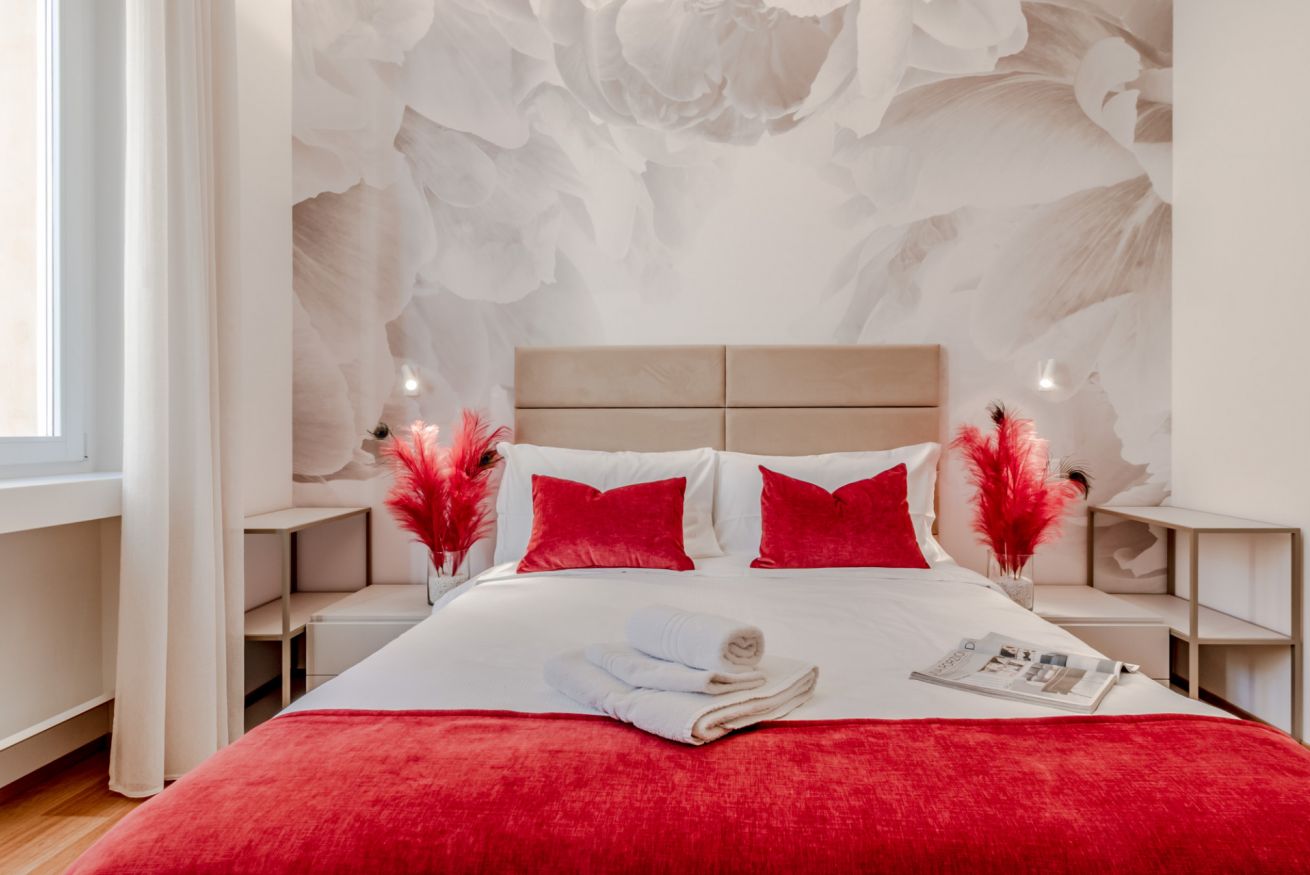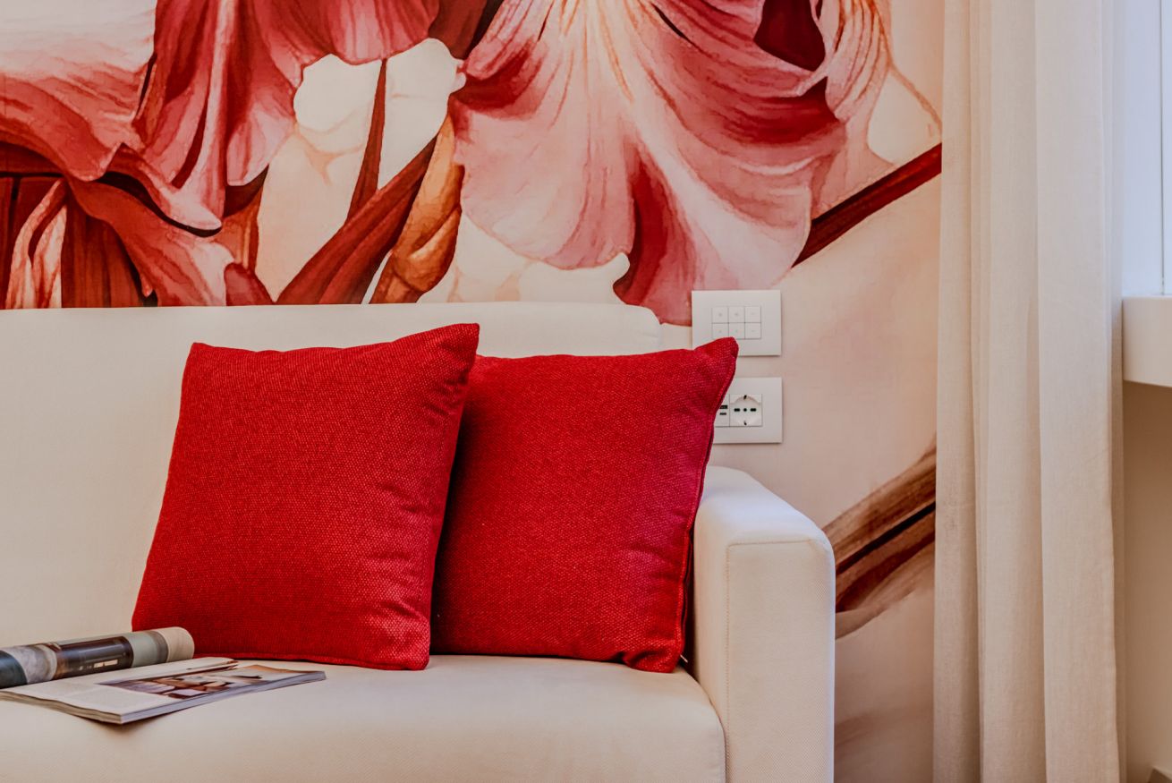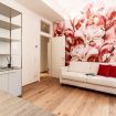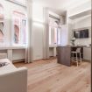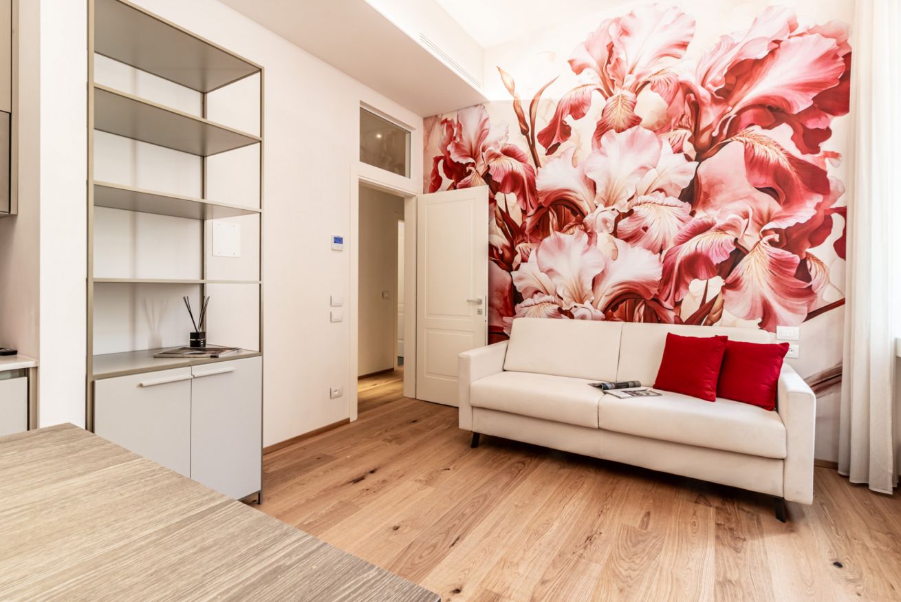 un corridoio che conduce a un'ampia zona living che comprende un divano, che all'occorrenza si apre e ospita due persone, una tv, un tavolo con sedie e un angolo cucina con forno, macchina per il caffè, bollitore, fornelli, microonde e lavastoviglie. Nella camera da letto troviamo un comodo letto e un ampio armadio. In bagno invece sono presenti un'ampia doccia, un lavandino, WC e bidet. L'appartamento è impreziosito da parquet in legno, ceramiche preziose e vasi ricercati.