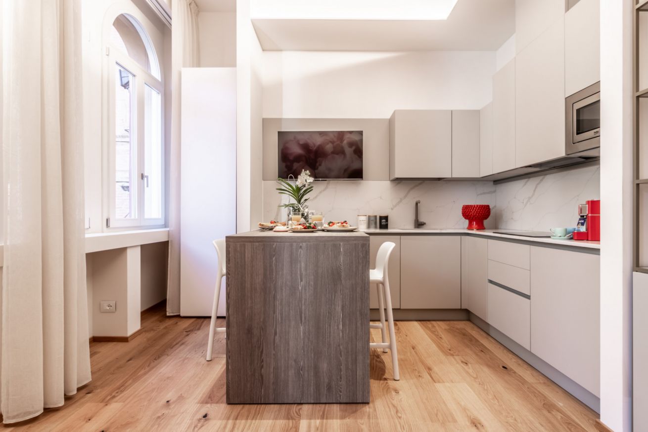 Questo prezioso bilocale, al primo piano con ascensore, è di recentissima costruzione. Decorato e rifinito nei minimi dettagli, è una vera chicca nel cuore di Bologna. Si apre su