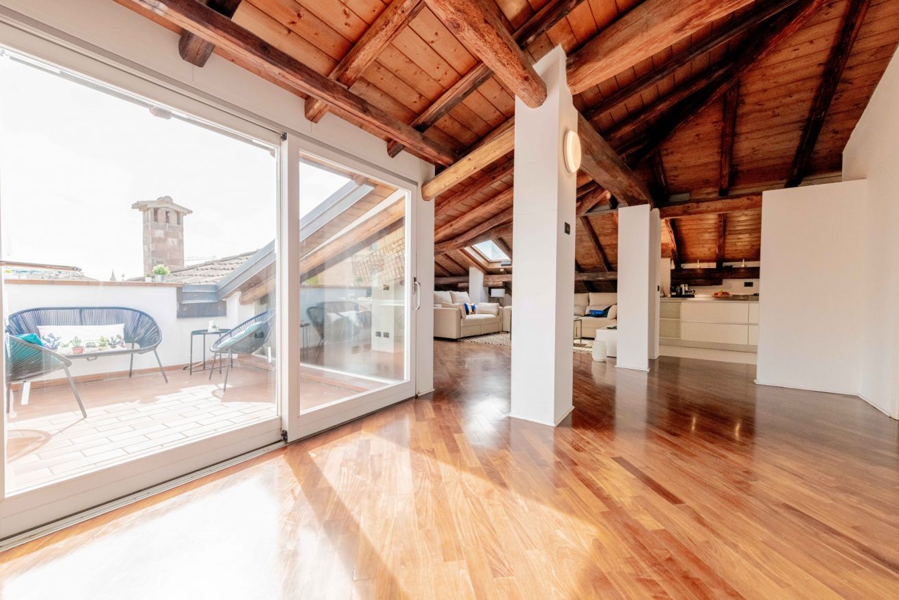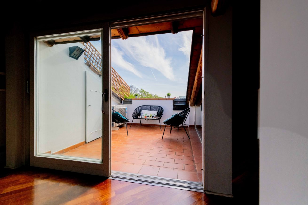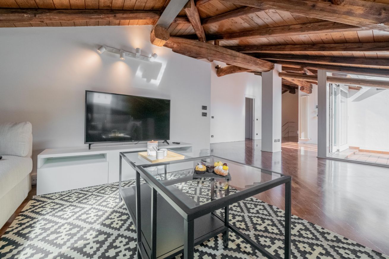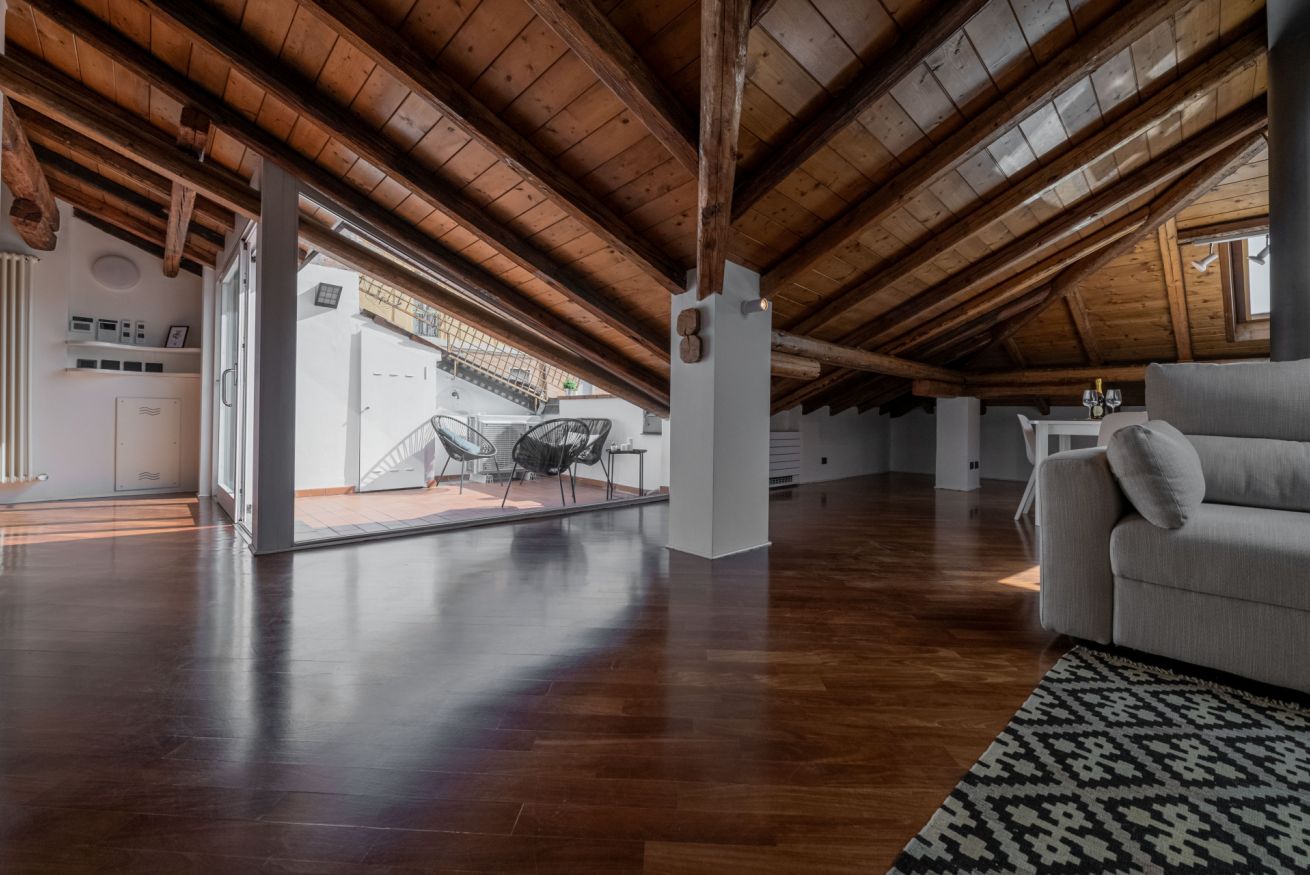 Luminoso ed elegante attico dotato di terrazza con vista sul centro storico. RK Attico Indipendenza è situato a due passi dai principali punti di interesse e dalla stazione centrale. Possibilità di posto auto scoperto nel condominio.